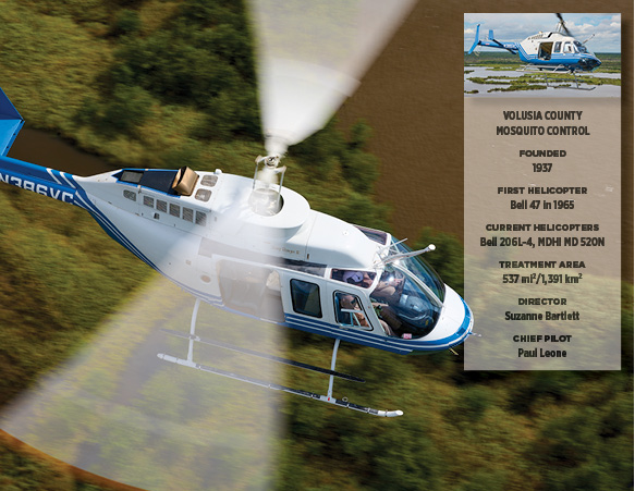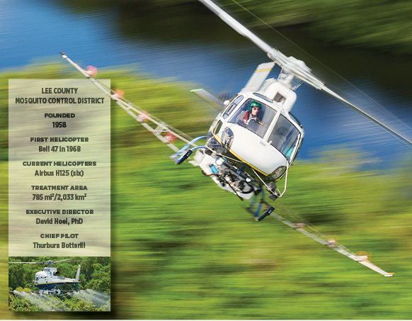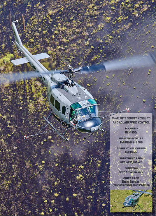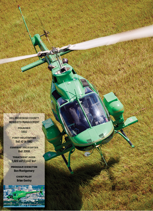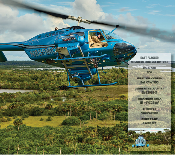 A Photo Essay by Mark Bennett Another case of helicopters saving lives (in this case, human, canine, and equine ones). We’ll be in the air by 0630, chasing a pair of helicopters into the rising sun, each loaded with larvicide, each intent on keeping this patch of Florida welcoming to humans by keeping it free of mosquitoes. Collier County’s Bell 407 prepares to launch a dawn assault on mosquito larvae near Naples, Florida, home to some 80 championship golf courses. The scene plays out regularly across the state throughout most of the year. Helicopter crews might start before the sun, as we did this day, or they might launch at dusk and fly past midnight. They’ll go up against the pests as much as needed, when needed, their routes precisely planned and flown, in a never-ending battle of good versus bug. The Challengers More than 80 species of mosquitoes inhabit the Sunshine State. Many are merely unwelcome annoyances, leaving us with no greater injury than an itchy welt. Some feed only on nonhuman animals, and a few feed only on plants. However, some species that feed on humans are potential vectors for diseases such as yellow fever, dengue, or the Zika or West Nile viruses. Some mosquitoes that feed on dogs or horses can spread heartworms or encephalitis, respectively. Florida’s warm, wet environment has hosted mosquitoes for centuries, but serious measures to control them weren’t undertaken until their role in spreading disease was understood. Thus it was in 1925, for both public comfort and health, that the first of what are now 58 governmental mosquito-control organizations was formed in the state. In the 1960s, helicopters joined the fight. In preparing this essay, I visited eight of those organizations that fight a common enemy across more than 5,000 square miles of forests, salt marshes, ponds, farms, golf courses, and neighborhoods. Why helicopters? Because their capabilities—mobility, agility, precision—essentially mirror those of their prey. Mosquitoes can be more than disagreeable visitors to an exposed patch of skin—they are potential vectors for a range of debilitating, and potentially lethal, diseases in humans, dogs, and horses. (Paul Landau photo) Not every mosquito-control program flies helicopters, and even for those that do, the aircraft are just one tool among many. But when a single aircraft can accomplish in 40 minutes what might take 10 trucks and crews four days, the value of rotary-winged assets is compelling. The Best Offense … The first step in controlling mosquitoes is reducing their opportunities to multiply. That includes commonsense efforts to keep objects like unused buckets, discarded tires, or even bird feeders from providing mosquitoes a place to lay their eggs. But even if every human-created reservoir were emptied, Florida—frequently rained on, rimmed by salt marshes, and run through with springs and slow-moving rivers (hello, Everglades!)—has countless natural habitats in which mosquitoes can always breed. Mosquitoes, however, are not always in need of control. It is important to determine which species are present and in what numbers. Remember, not all species feed on humans (or dogs and horses). There’s no need to eradicate nonpest mosquitoes, as these insects are part of the food chain for fish, birds, amphibians, and other insects. They are also pollinators. The types and populations of mosquitoes are affected by temperature, humidity, rainfall, and tides, so inspections are carried out daily, by sampling water for larvae, checking for adults in traps, or by simply leaving an arm exposed while standing outside. Helicopters play a role by quickly transporting inspectors to distant traps or known environments, or to locations that might be near but otherwise difficult to access. Another factor that figures into management plans is disease. Only certain species carry certain diseases, but the mere presence of those species does not, by itself, mean that disease is present. Thus, reports from hospitals, tests of trapped mosquitoes, and, for at least one mosquito-control organization, tests of the blood of chickens purposefully housed where they are exposed to mosquitoes are constantly monitored. The (Partial) Solution When intervention is required, people and equipment can be mobilized for attack on foot, by truck, or by air. If helicopters are part of the plan, a lot of planning goes into those operations. Sophisticated computer programs are used to plot the areas needing treatment, and then exact flight paths are calculated to deliver the proper dose of materials, whether dry or liquid, depending on altitude, humidity, and prevailing winds. Those flight paths are loaded into dedicated avionics systems that control and track the flow of materials, overlaying that data with the track of the aircraft. Mosquito larvae need water to grow and develop into adulthood, which means they are easier to target than adult, flying mosquitoes. The favored weapon is a bacterium, Bacillus thuringiensis israelensis (Bti), that, when ingested by the larvae, leads to a rupturing of their digestive tracts, killing them. Besides mosquitoes, Bti is injurious to only a couple other species of insects that, coincidentally, also spread disease. The bacterial agent is typically delivered in pellet form, flung outboard from hoppers on either side of the aircraft. If the mosquitoes are not defeated as larvae, helicopters can apply plant-based poisons or synthetic versions of them. Booms jut out from the fuselage to deliver liquid to nozzles and fans that atomize it and spread the resultant mist. Because the poisons are also harmful to bees and butterflies, very low volumes of these solutions are applied, and such missions are flown after most of those desirable insects are already bedded down for the night or not yet up in the morning. Fortunately for the mosquito hunters, evening and dawn are when mosquitoes are most active anyway. Glamorous? No. Importa